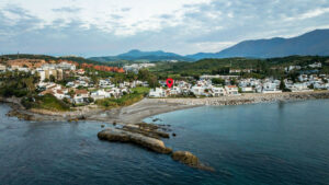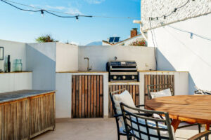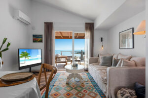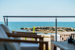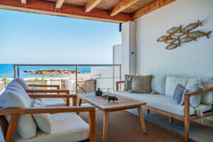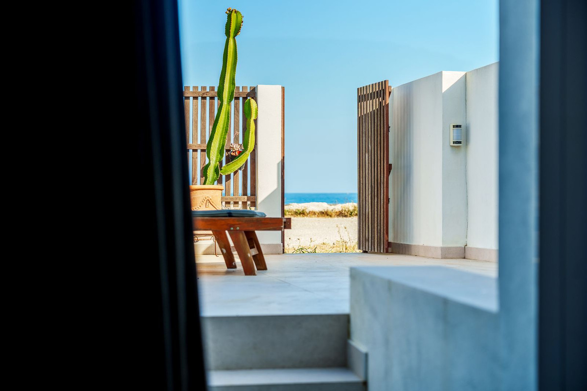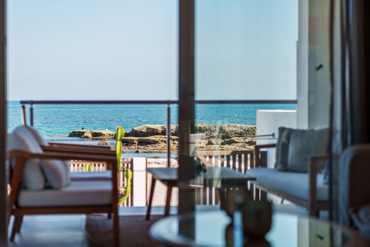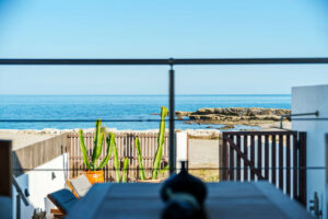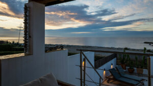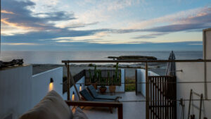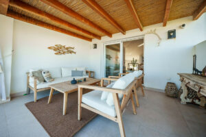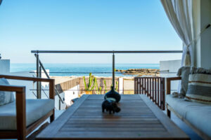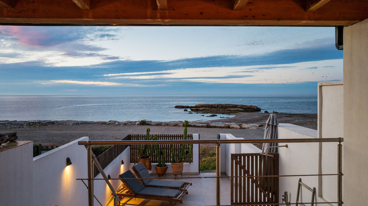 Arriba, la terraza cubierta elevada ofrece una sofisticada zona de estar, con cómodos sofás y una elegante mesa de centro, donde podrá disfrutar de unas vistas incomparables del mar y la playa desde la intimidad de su propio refugio.