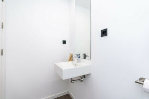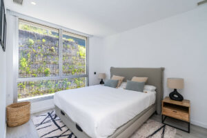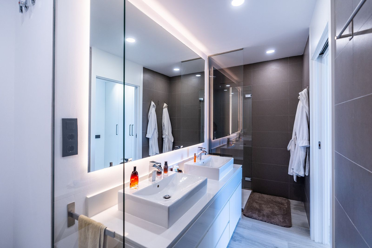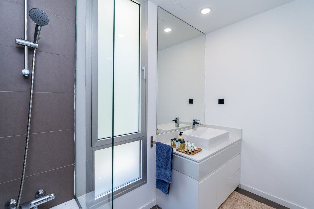 La segunda planta alberga tres dormitorios. Dos de ellos son habitaciones de invitados con baño compartido en el pasillo. El dormitorio principal cuenta con baño en suite reformado con mamparas de cristal y mueble bajo lavabo, así como un amplio vestidor y un armario doble. La pared divisoria ha sido decorada también con cemento proyectado, manteniendo una coherencia estética de diseño moderno y sofisticado.