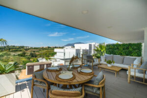 En la planta superior, el solárium ofrece un espacio amueblado perfecto para disfrutar de las tardes y noches con vistas panorámicas al atardecer. Incluye toldo para sombra, además de preinstalación de agua y electricidad, ideal para montar una cocina exterior o zona chill-out.