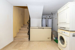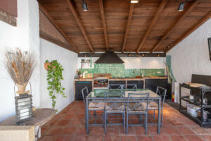 Además, una pérgola adyacente a la cocina exterior ofrece un espacio perfecto para disfrutar al aire libre. El amplio y acogedor salón, amueblado y con chimenea, es ideal para relajarse después de un día en la playa. El garaje privado, con capacidad para 2 vehículos, zona de almacenaje y taller, junto con un área de lavadero en el nivel del sótano, brindan comodidad y espacio adicional.