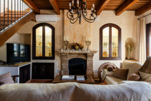 El salón es amplio y cuenta con otra chimenea de leña, con acceso directo a una segunda terraza que conecta de manera fluida con el exterior. En la segunda planta, una luminosa habitación con varias ventanas ofrece vistas panorámicas impresionantes de la propiedad y las montañas circundantes, además de una excelente ventilación cruzada.