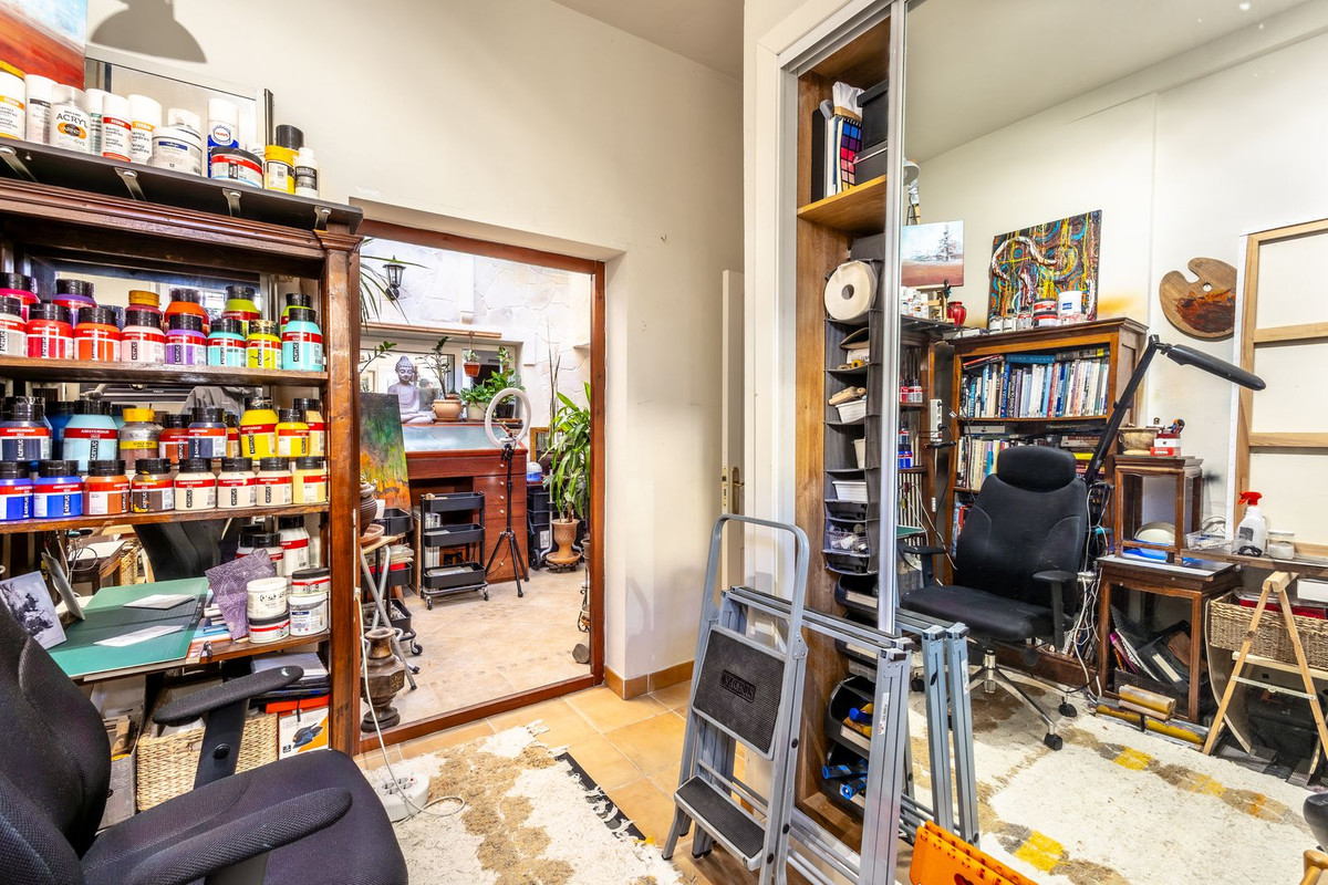Junto al salón-comedor se encuentra una cocina grande, moderna y de alta calidad, equipada con electrodomésticos Bosch. El pasillo, largo y amplio, conduce al segundo dormitorio, también de buen tamaño, a un baño con ducha en la planta baja y a una sala adicional tipo atrio, que actualmente funciona como estudio de arte.