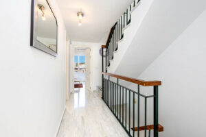 Junto al salón-comedor se encuentra una moderna cocina totalmente reformada, equipada con electrodomésticos nuevos y, de forma poco habitual, con dos ventanas que ofrecen vistas al jardín y a las zonas comunitarias. Frente a la cocina hay un práctico aseo en la planta baja y un espacio de almacenamiento opcional bajo la escalera.