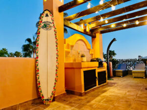 Segunda planta: Zona de barbacoa con cocina, ¡sin necesidad de bajar! Mesa para 6 personas y zona de estar, algunas vistas al mar desde este nivel.