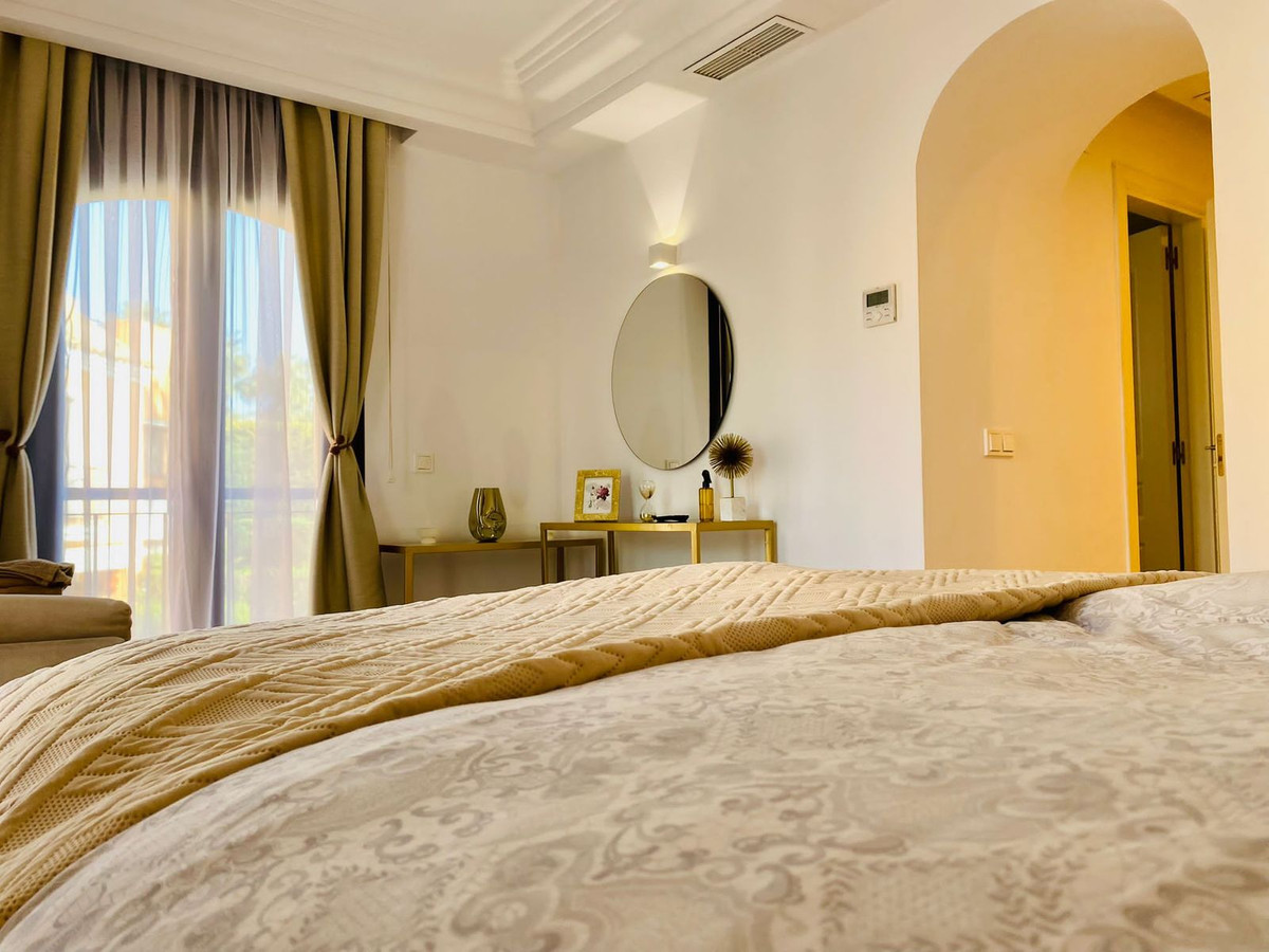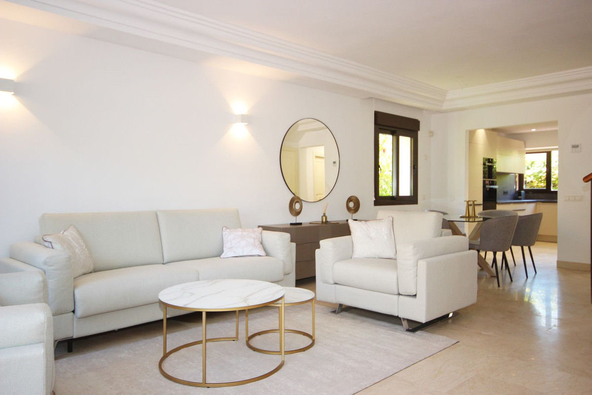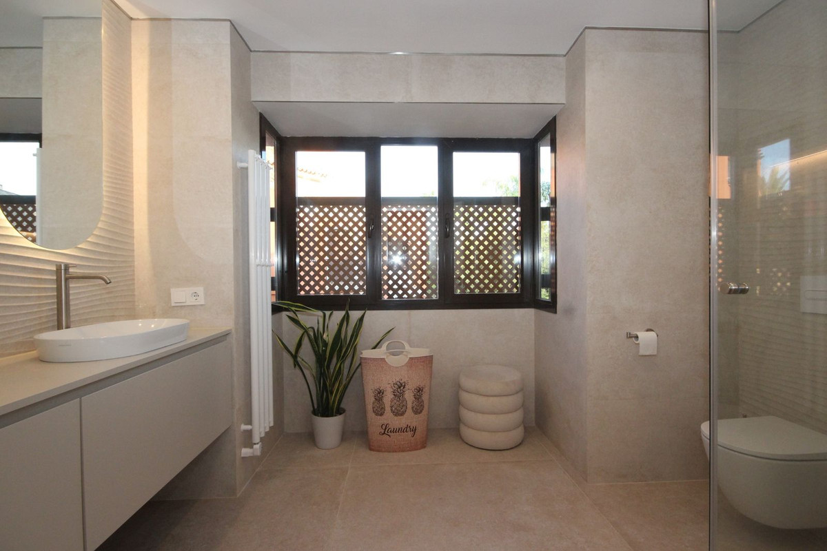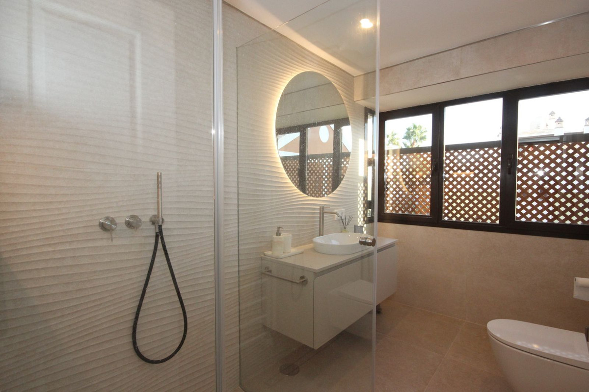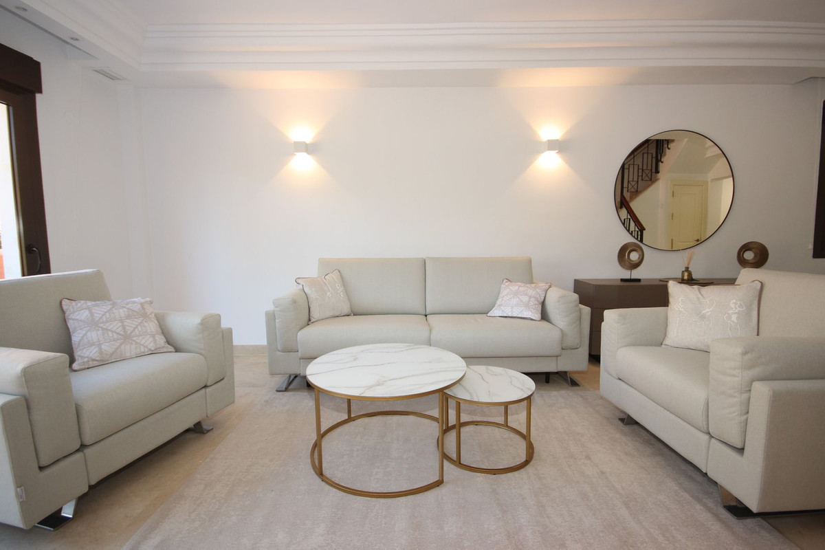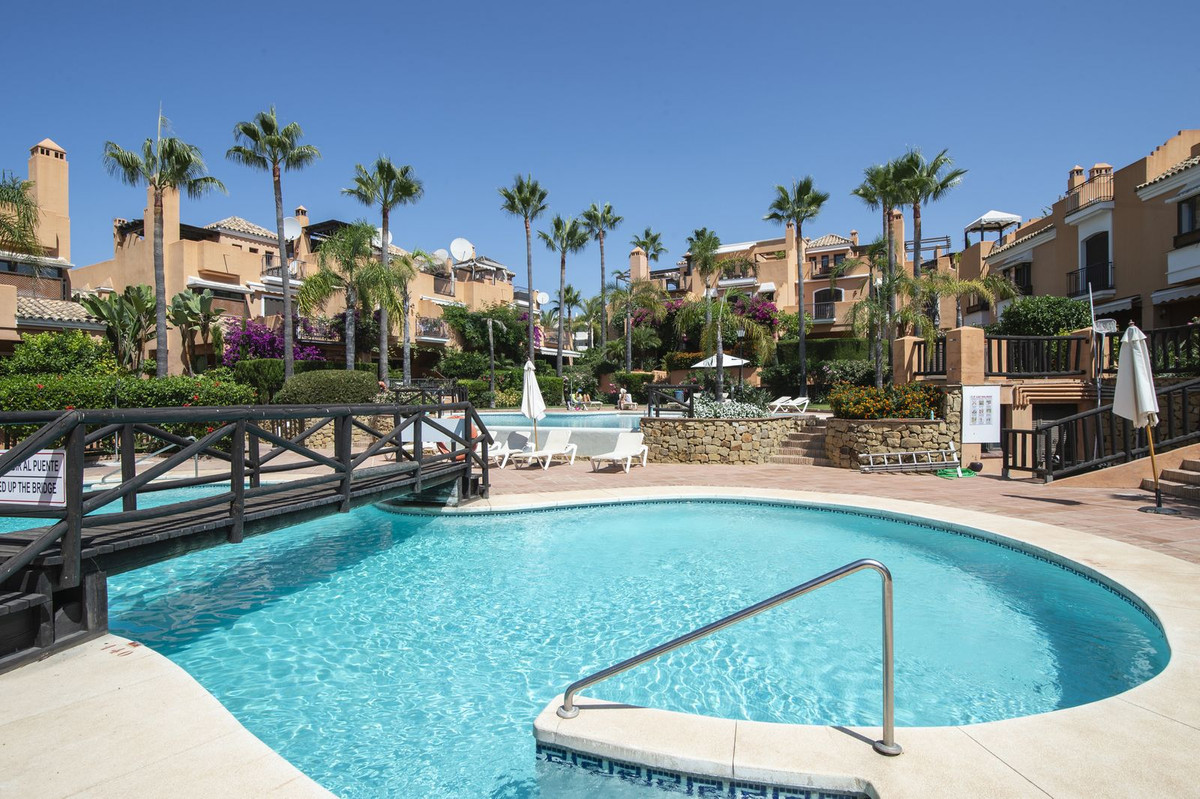 Esta casa adosada está situada a solo 100 m de la playa en Bahía de Marbella. Tiene 2 dormitorios y 2 baños, además de un aseo para invitados.