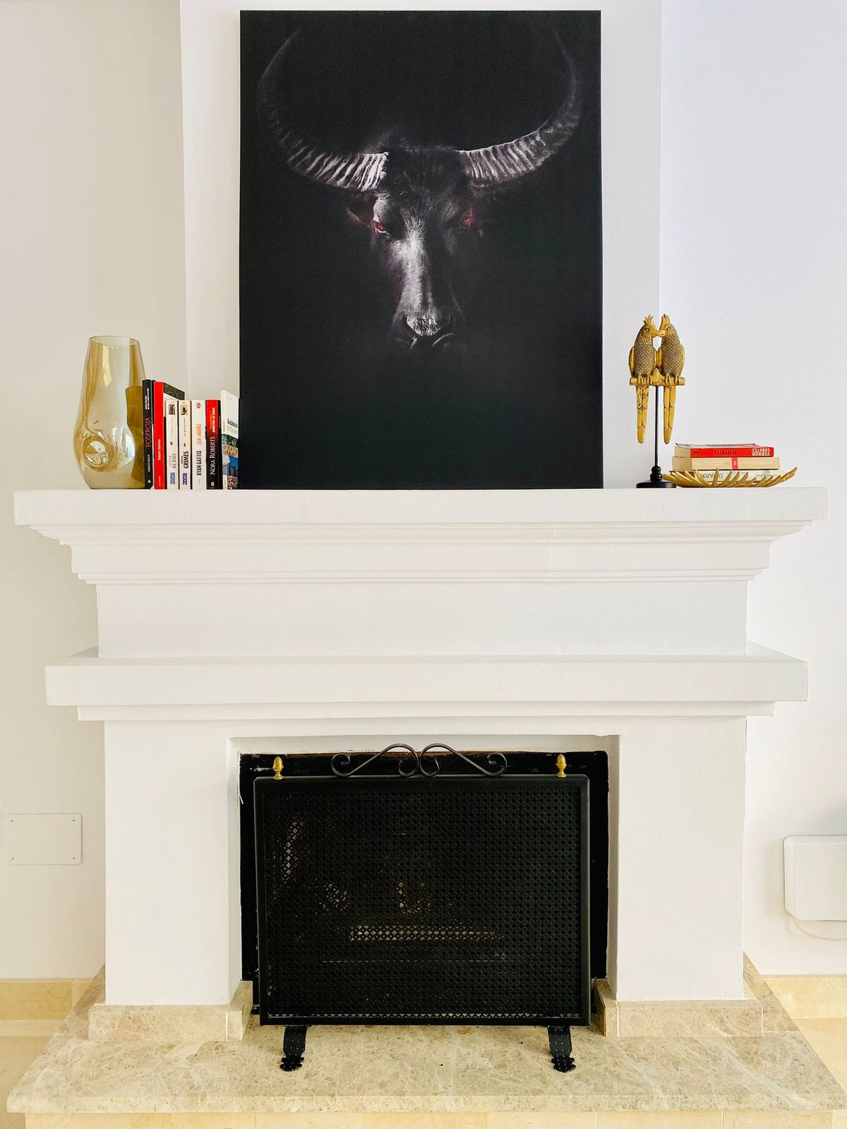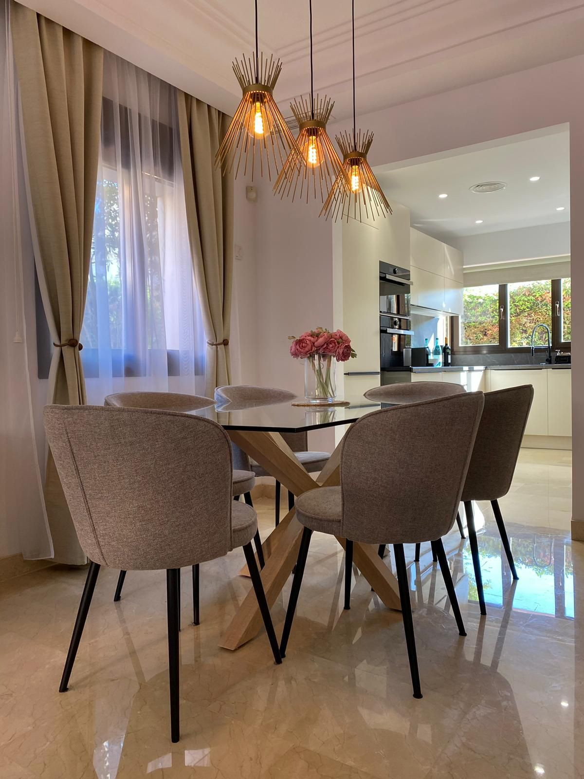 Planta baja: salón-comedor con una gran mesa de cristal para 6 personas, chimenea, abierto a la nueva cocina y con acceso a la terraza. En esta planta también hay un aseo para invitados.