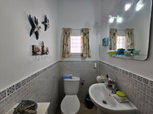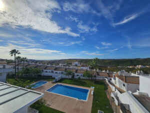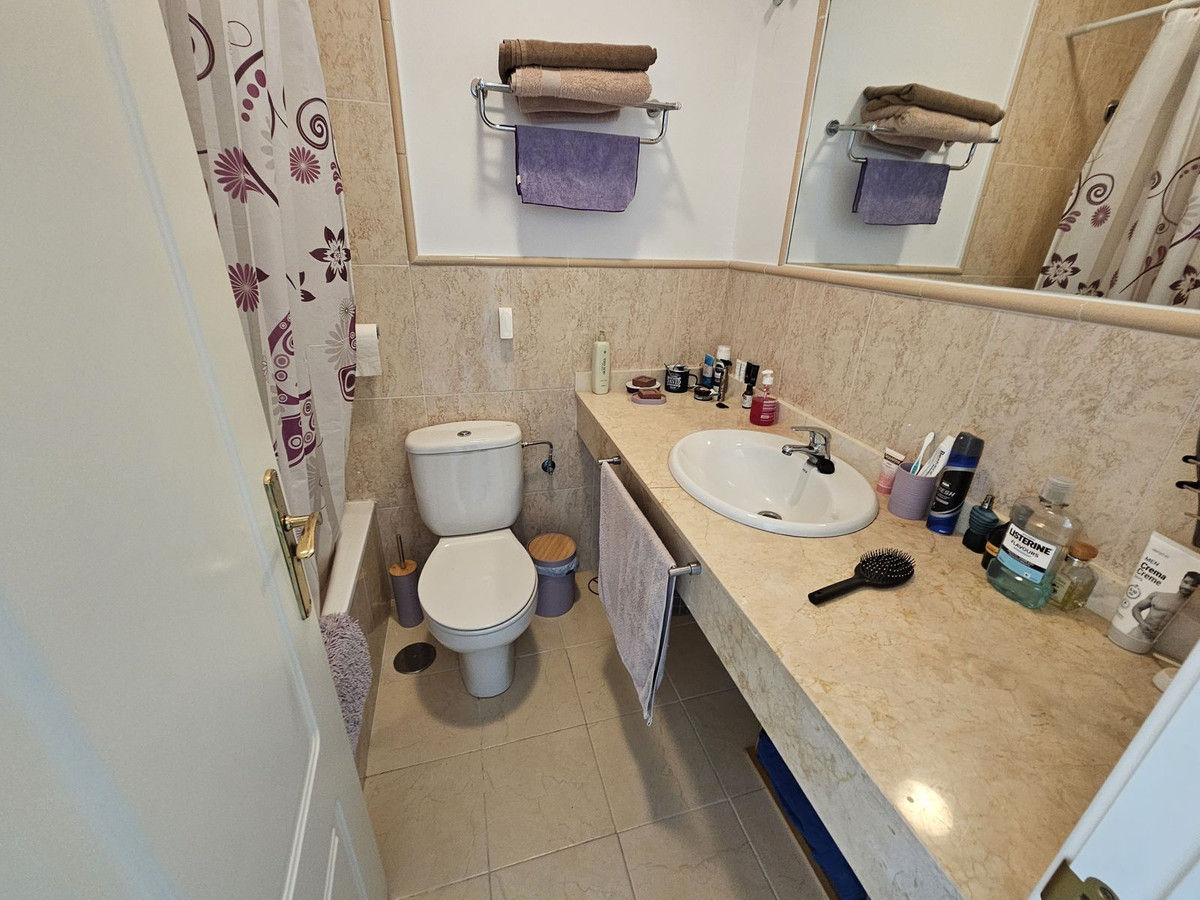 La entrada desde el aparcamiento se encuentra en la planta baja. En esta planta encontrará dos dormitorios, ambos con baño privado. Los dos dormitorios son amplios y dan a una terraza orientada al suroeste. Hay una gran piscina comunitaria y también una piscina infantil. La zona de la piscina comunitaria cuenta con duchas.