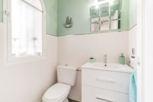 Al acceder a la vivienda encontramos un práctico aseo de invitados. A continuación, se abre un amplio y luminoso salón-comedor con chimenea y una moderna cocina abierta totalmente equipada. Desde esta estancia ya se disfrutan unas impresionantes vistas al mar y a la playa. Bajo la escalera se ha aprovechado el espacio para crear un cómodo trastero.