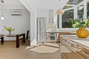 El salón-comedor, de generosas dimensiones, se abre a una moderna cocina de concepto abierto, totalmente equipada y renovada con materiales de alta calidad. Grandes ventanales permiten la entrada de luz natural durante todo el día, aportando calidez y amplitud a los espacios.