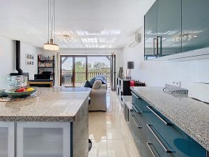 * Salón de Planta Abierta: El salón, luminoso y diáfano, fluye sin esfuerzo desde la cocina, creando un espacio de vida moderno y cohesivo.