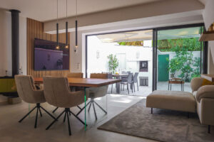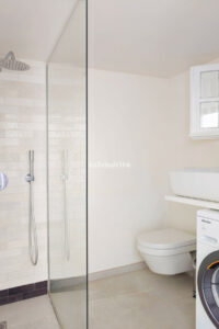 Totalmente renovada con una sensibilidad contemporánea, la vivienda se despliega en dos niveles concebidos para maximizar tanto el espacio como la luz natural. En la planta principal, un luminoso salón-comedor de planta abierta fluye con naturalidad hacia una elegante cocina blanca de diseño moderno. En su corazón, una escultural chimenea de hierro y cristal aporta calidez y sofisticación, mientras que unas puertas acristaladas de suelo a techo se abren a un soleado patio privado—un escenario ideal para mañanas relajadas, cenas al aire libre o veladas con amigos. Junto a la terraza, una encantadora y funcional dependencia alberga una zona de lavandería, aseo y ducha, combinando practicidad con discreto estilo.