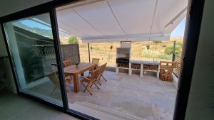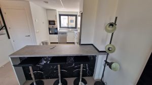 Planta principal: Acogedor porche de entrada con plaza de aparcamiento. En el interior, encontramos un aseo de cortesía y una elegante cocina abierta con isla, totalmente equipada, que conecta con un amplio salón de forma cuadrada. Sus grandes ventanales aportan una excelente luz natural y dan acceso a una agradable terraza con vistas despejadas al campo. La vivienda dispone de doble acristalamiento, mosquiteras y toldos eléctricos.