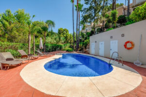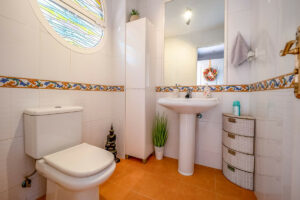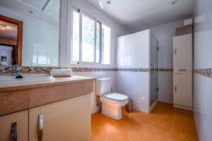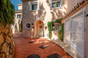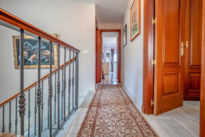 En la planta superior, una elegante escalera conduce a un amplio rellano y tres dormitorios de generosas dimensiones. La suite principal cuenta con armarios empotrados, un moderno baño en suite y una terraza solárium privada, ideal para relajarse con la luz de la mañana. Los dos dormitorios adicionales también incluyen armarios empotrados y comparten un elegante baño familiar con ducha recientemente renovado. A solo 30 segundos a pie de su puerta principal se encuentra la encantadora piscina y solárium de la comunidad. Tranquila y poco concurrida, gracias al reducido número de viviendas de la urbanización, es un oasis de serenidad perfecto para refrescarse o tomar el sol.