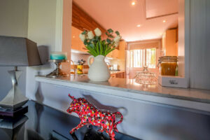 Una ventana pasaplatos entre la cocina y el comedor no solo le aporta carácter, sino que también facilita la recepción, manteniendo el espacio luminoso y abierto.