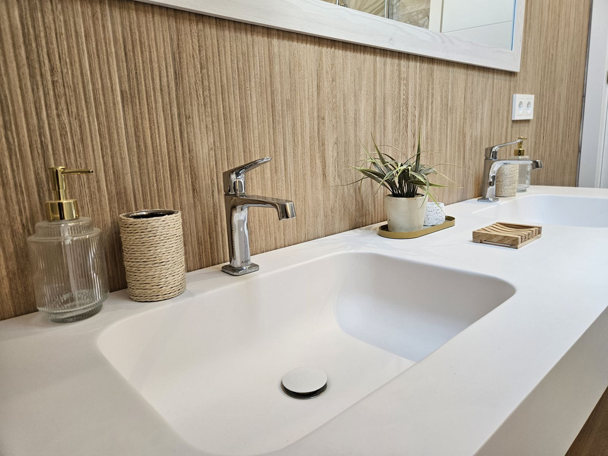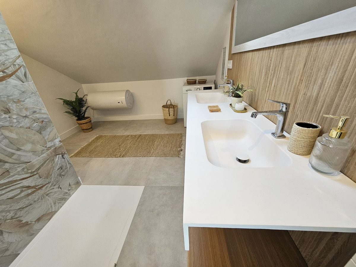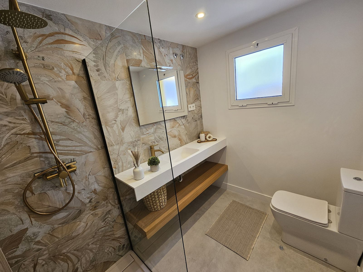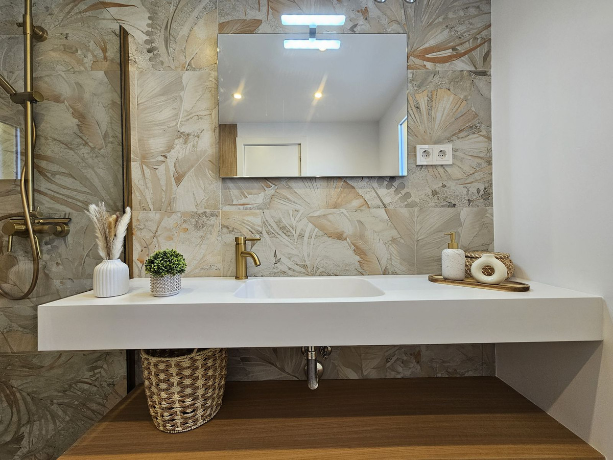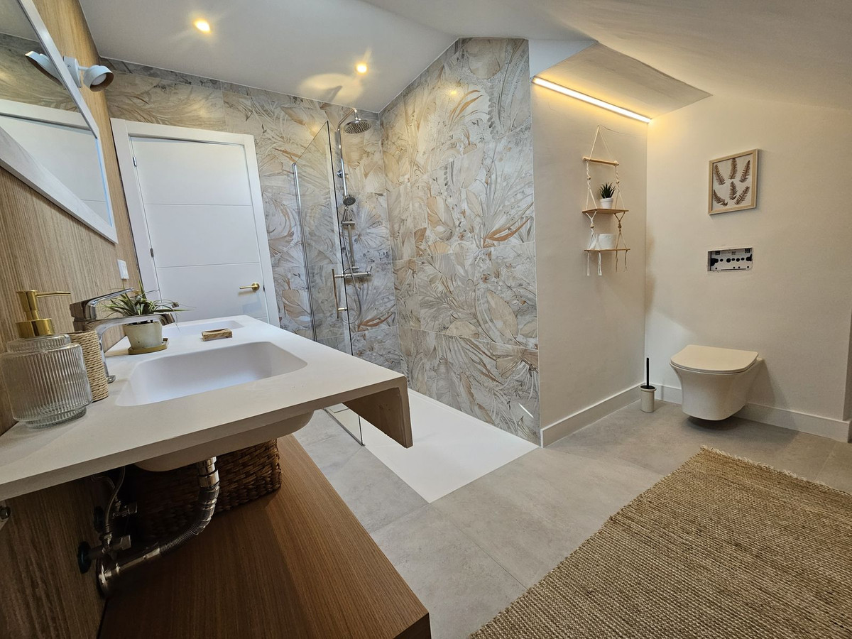 En la planta baja, encontrarás un elegante salón diáfano con cocina integrada, un acogedor dormitorio y un moderno baño. Desde aquí, se accede a una impresionante terraza parcialmente cubierta con zona chill-out y piscina privada, ideal para disfrutar de los días soleados. La entrada a la casa también cuenta con otro pequeño espacio exterior. La primera planta ofrece dos dormitorios más, con terraza privada en el dormitorio principal y un segundo baño, perfecto para la comodidad de todos. El garaje doble privado y cerrado se encuentra en el sótano.