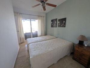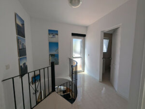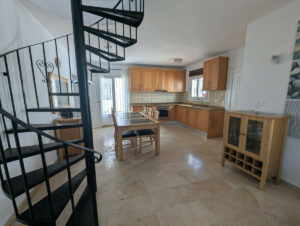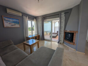 La vivienda se distribuye en dos plantas y cuenta con tres amplios dormitorios y dos baños. En la planta superior, dos de los dormitorios tienen acceso a una terraza privada con agradables vistas a los jardines, la piscina e incluso al mar. El interior es luminoso y espacioso, con suelos de mármol y una acogedora chimenea que aportan calidez y elegancia durante todo el año.