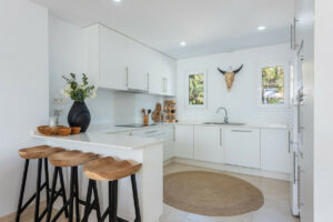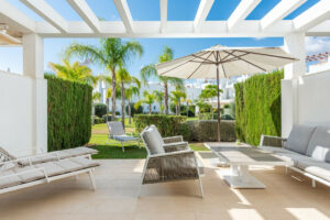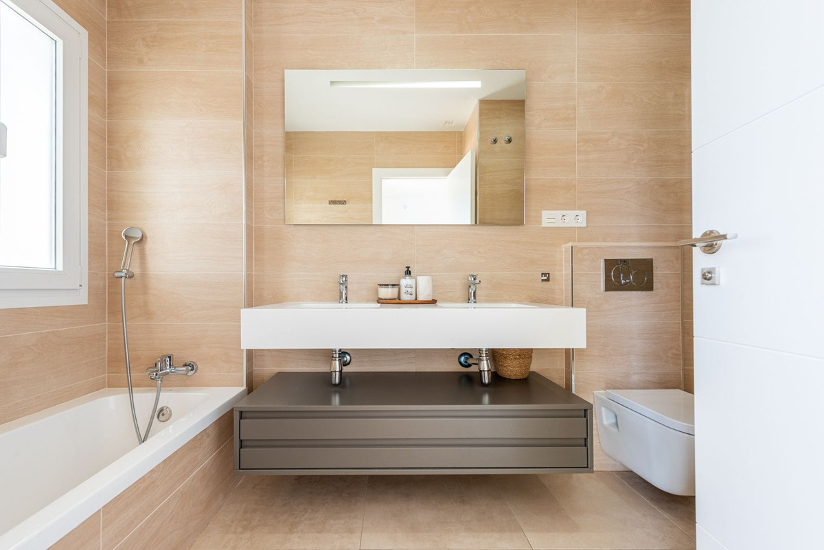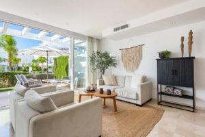 Moderno adosado con interior de estilo Bali, diseñado con tonos tierra y materiales naturales que evocan un ambiente cálido y tropical.