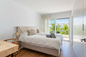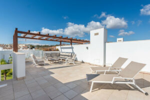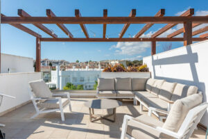 Una escalera flotante conduce a la planta con 3 dormitorios y 2 baños con calefacción por suelo radiante. Esta planta también ofrece acceso a un impresionante solárium con pérgola.