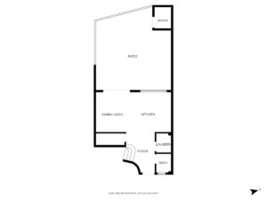 Planta baja: Cocina abierta con comedor, salón con doble altura, aseo, habitación con termo eléctrico, zona de lavandería y varios espacios de almacenamiento.