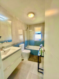 Se distribuye de la siguiente manera: aseo de invitados, cocina abierta totalmente equipada con electrodomésticos Bosch, salón comedor con TV de 65 pulgadas y