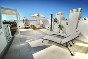 El punto culminante de la propiedad es el gran solarium en la azotea – un oasis privado con impresionantes vistas al mar y sol todo el día. Con mucho espacio para una zona de comedor, salón y cocina al aire libre, es el lugar perfecto para relajarse, entretener y disfrutar de los atardeceres de Marbella.