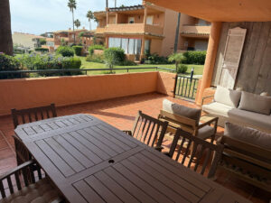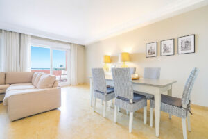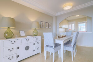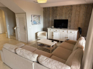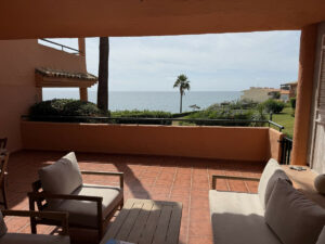 Esta fantástica propiedad se encuentra en Bermuda Beach, en una envidiable primera línea de playa con vistas panorámicas al mar. La propiedad ha sido renovada con altos estándares de calidad, incluyendo una cocina y baños nuevos de estilo moderno y contemporáneo. El resultado es impresionante y la convierte en una lujosa casa familiar perfecta. Las vistas se aprecian desde el momento en que se entra en la propiedad, lo que la hace aún más impresionante. La terraza, que da al salón, cuenta con un amplio espacio para tumbonas, una gran mesa de comedor y sillas. En la planta superior se encuentran los dormitorios: el principal con baño en suite y un amplio balcón con increíbles vistas al mar, y otros dos dormitorios de invitados que comparten un baño. Hay un espacio privado para el coche y hay un supermercado y restaurantes a poca distancia a pie, a solo 10 minutos en coche de Estepona. Una propiedad con una excelente relación calidad-precio en una ubicación inmejorable. Se permiten alquileres de corta estancia.