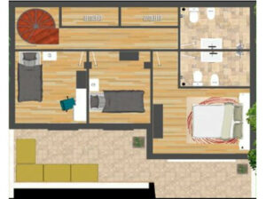 Esta casa se levanta sobre una parcela de 900 m², desarrollada en dos plantas, con una superficie de 124 m² construidos, distribuidos entre: planta primera, con cocina abierta a salón-comedor, aseo y