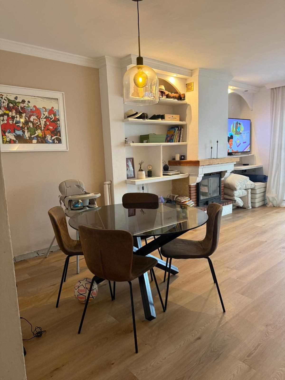 Planta principal: Luminosa, salon comedor muy amplio, con chimenea, con salida a una magnífica terraza-porche y al jardin comunitario con la piscina, ideal para tener controlados a los pequeños de la casa.