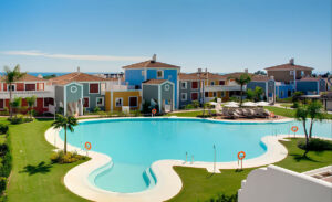 Comunidad cerrada con servicio de conserjería 24 horas, piscinas, jardines tropicales y bar en la piscina.
