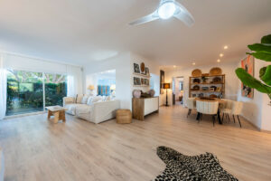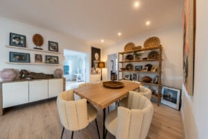 La casa le da la bienvenida con espacios luminosos, donde las texturas naturales, los suaves tonos neutros y los detalles artesanales crean una elegancia cálida y natural. El salón se integra a la perfección con el comedor, decorado con materiales orgánicos, detalles en tejido y una decoración cuidadosamente seleccionada que evoca un ambiente costero relajado y sofisticado.