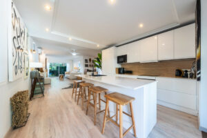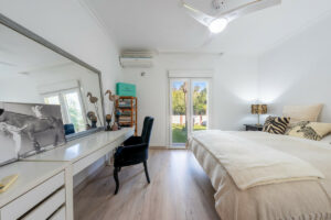 La cocina abierta y funcional complementa el estilo de la casa con líneas limpias y sutiles acabados en tonos tierra, ideal tanto para el día a día como para el entretenimiento. Los tres dormitorios son amplios, diseñados como remansos de paz con textiles en capas, maderas naturales y una atmósfera tranquila y espaciosa. Los baños siguen la misma estética, combinando sencillez con carácter.