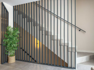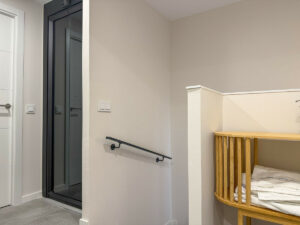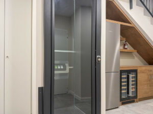 El acceso directo desde la plaza de aparcamiento privada ofrece privacidad y comodidad. Un ascensor privado conecta las tres plantas de la vivienda, una característica premium poco habitual en casas adosadas, que garantiza un acceso cómodo a toda la propiedad.