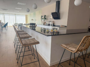 La zona principal de estar es luminosa y acogedora, y se abre a una amplia terraza orientada al oeste. Grandes puertas de cristal permiten que la luz natural inunde el interior, creando al mismo tiempo una transición fluida entre el salón y el espacio exterior. La terraza ofrece espacio suficiente tanto para una zona de descanso como para un comedor al aire libre, lo que la convierte en un lugar ideal para disfrutar de veladas relajadas y recibir invitados.