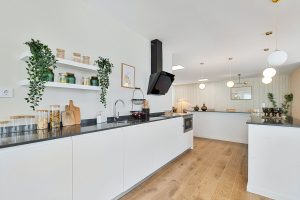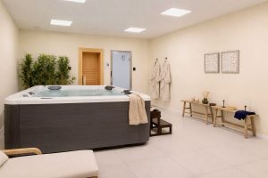 Planta principal: salón luminoso con cocina abierta y salida directa al jardín privado con jacuzzi.