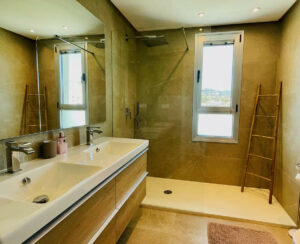 En la planta superior hay 3 dormitorios y 2 modernos cuartos de baño con ducha. El dormitorio principal destaca por su vestidor, su gran luminosidad y su acceso directo al cuarto de baño con vistas. En la planta baja le espera una cocina abierta y totalmente equipada con barra de desayuno, el luminoso salón-comedor integrado con acceso a la terraza privada del jardín y un aseo para invitados.