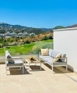 La terraza ofrece mucha privacidad, espacio para un salón y un comedor, con magníficas vistas al campo de golf "Europa".