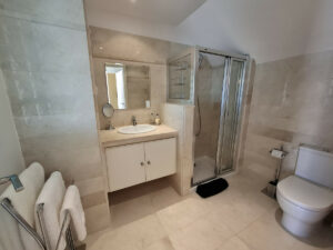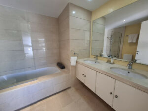 • 3 baños completos, con alicatado de mármol de primera calidad, baño principal con suelo radiante, ducha enorme y bañera de hidromasaje con vistas al mar