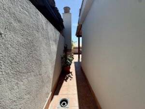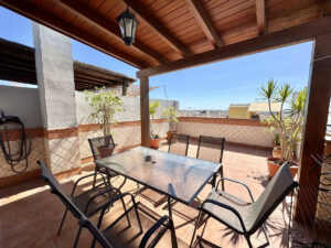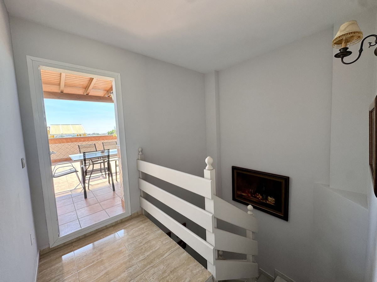 Se distribuye en tres plantas: en la baja, salón-comedor con chimenea, cocina independiente, baño con ducha y acceso a un patio totalmente cerrado. En la primera planta, tres dormitorios con armarios empotrados y un baño completo. La planta superior ofrece una zona de lavandería y un amplio solárium con pérgola y trastero.