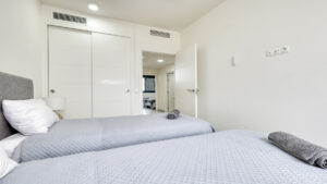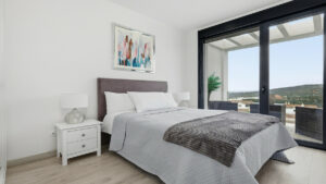 La planta inferior está destinada a la zona de descanso y ofrece tres dormitorios. El dormitorio principal es amplio y dispone de baño en suite con ducha, además de un balcón privado perfecto para relajarse y disfrutar de las vistas al mar. Los otros dos dormitorios dobles cuentan con armarios empotrados y persianas, y entre ellos se sitúa un baño familiar moderno con ducha tipo walk in.