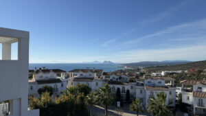 Este adosado de tres dormitorios se encuentra en la conocida urbanización Golden View I, una comunidad residencial elevada que destaca por sus vistas abiertas al mar, con panorámicas que alcanzan Gibraltar y la costa de Marruecos. Su orientación suroeste garantiza abundante luz natural y espectaculares puestas de sol durante todo el año.