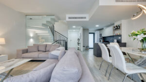 Uno de los grandes atractivos de la vivienda es el amplio solárium en la azotea, pensado para disfrutar al aire libre con total comodidad. Desde aquí se disfrutan vistas abiertas al mar mientras se relaja en el jacuzzi, con capacidad para hasta seis personas. El solárium cuenta además con una cocina exterior totalmente equipada, ideal para reuniones y comidas al aire libre. Los propietarios han añadido espacio de almacenamiento adicional en esta planta, incluyendo frigoríficos y congeladores, lo que resulta muy práctico.