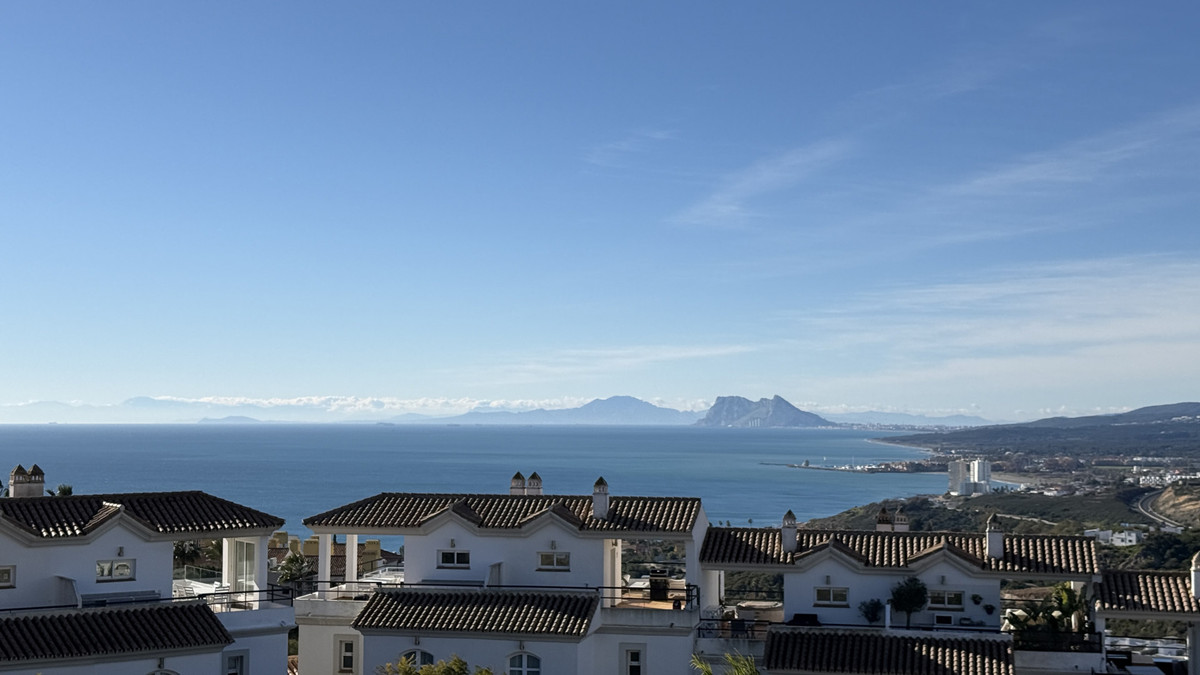 Este adosado de tres dormitorios se encuentra en la conocida urbanización Golden View I, una comunidad residencial elevada que destaca por sus vistas abiertas al mar, con panorámicas que alcanzan Gibraltar y la costa de Marruecos. Su orientación suroeste garantiza abundante luz natural y espectaculares puestas de sol durante todo el año.