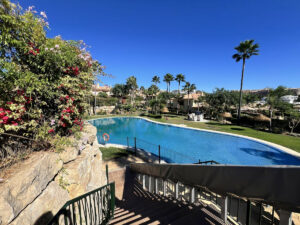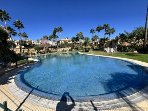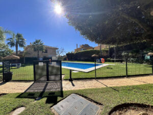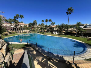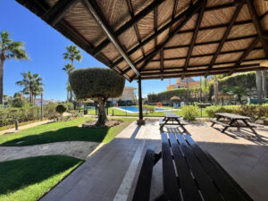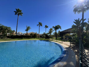Las zonas comunes incluyen dos piscinas, una de ellas abierta todo el año, y zona de barbacoa con mesas. El mantenimiento del jardín está incluido en los gastos de comunidad.