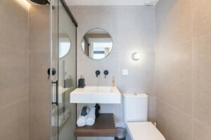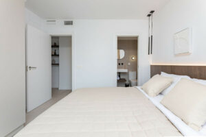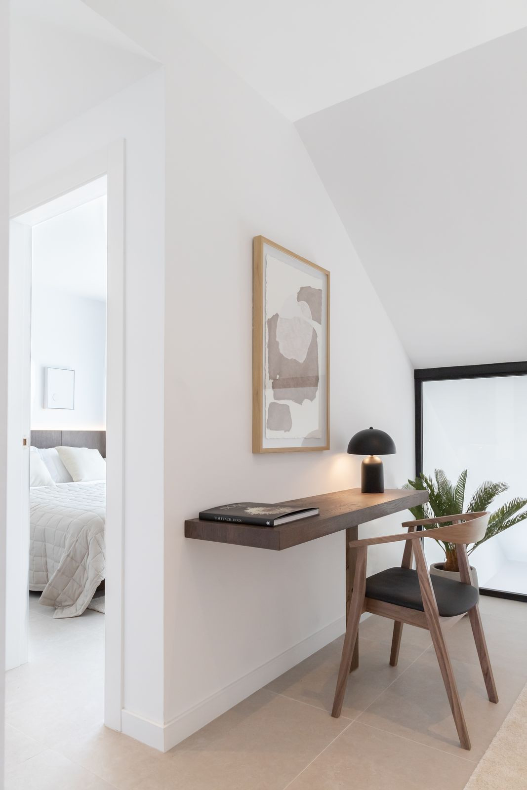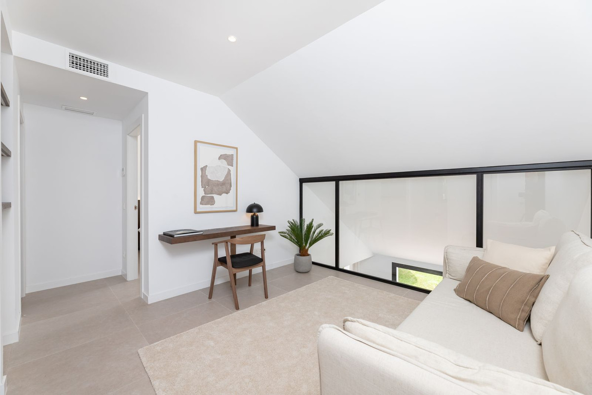 En la planta superior hay dos dormitorios adicionales y dos baños. El dormitorio principal dispone de una terraza privada con tumbonas y vistas a la urbanización y al valle. Además, en el pasillo hay un espacio de oficina y un sofá cama convertible en cama queen-size, ofreciendo alojamiento extra para invitados o una zona de trabajo remoto si es necesario.
