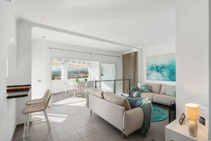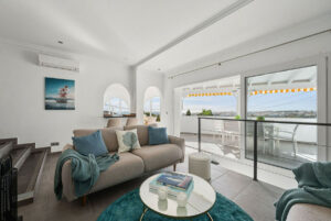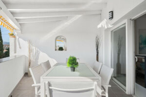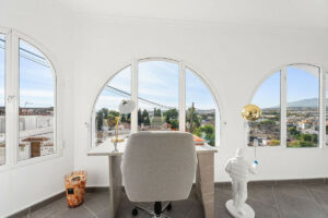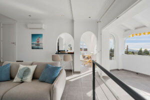 Preciosa casa de 3 dormitorios con vistas panorámicas al mar y a un paseo de todos los servicios locales. Ubicada en una calle tranquila de sentido único en el corazón de La Campana, esta casa cuenta con 3 amplios dormitorios, cada uno con baño integrado, además de un aseo de invitados. El salón se abre a una terraza de 18 m² con vistas al mar, Gibraltar y África. La casa está orientada al sur/oeste y disfruta del sol de tarde en el salón y la cocina, además de una espectacular puesta de sol. El tercer dormitorio se encuentra en la planta baja con puerta de acceso independiente, ideal para invitados o niños mayores. Está totalmente equipada con aire acondicionado, cocina totalmente equipada y dos trasteros con lavadora, estanterías y calentadores de agua eléctricos. Además, hay una segunda terraza exterior cerca de la entrada de la parcela, rodeada de hermosas buganvillas e hibiscos en flor.