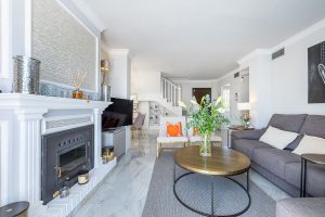 La propiedad cuenta con una cocina de diseño totalmente equipada con frigorífico-congelador estilo americano con dispensador de agua y hielo. El luminoso y espacioso salón, con una acogedora chimenea, se abre a una generosa terraza soleada, desde la cual se accede a un útil área de servicio exterior, añadiendo gran practicidad. La terraza ofrece vistas panorámicas a La Concha y Puerto Banús.