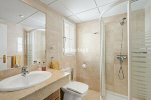 En la planta superior, hay dos dormitorios en suite excepcionalmente espaciosos. Originalmente diseñada como una propiedad de tres dormitorios, puede volver a convertirse fácilmente para acomodar un tercer dormitorio si así se desea. Sobre este nivel, la propiedad cuenta con una terraza solárium, que proporciona un espacio exterior adicional con potencial para tomar el sol, relajarse o recibir invitados mientras disfruta de las vistas del entorno.