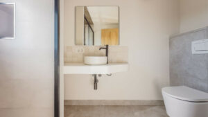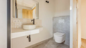 En esta planta también se sitúa un elegante baño perfectamente terminado con amplia ducha a ras de suelo, mueble, lavabo, espejo y WC.