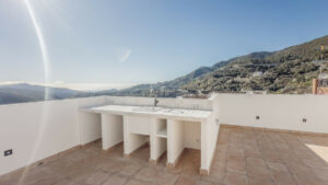 Desde aquí, otra cómoda escalera conduce a la espectacular terraza solárium con impresionantes vistas al pueblo, al entorno natural y con vistas únicas al mar. Dispone además de cocina exterior con fregadero y grifo.