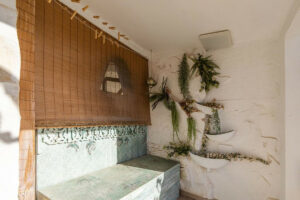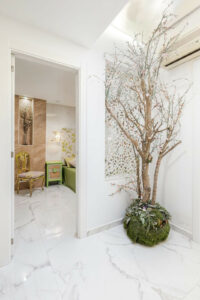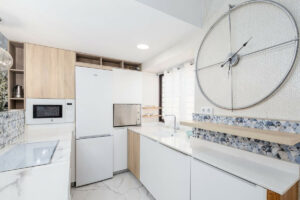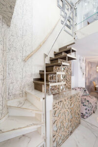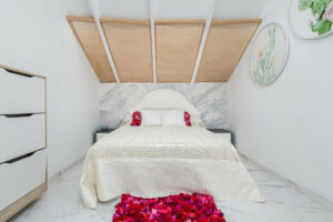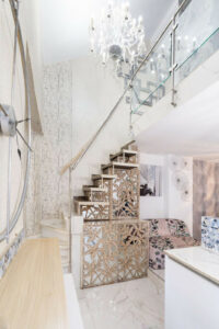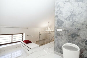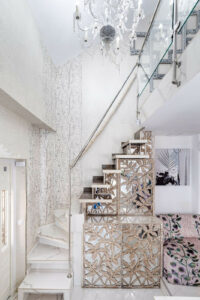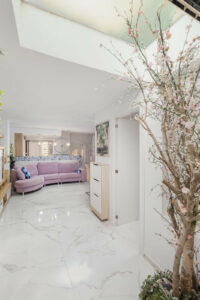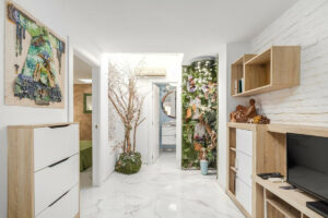 La casa tiene dos plantas de aproximadamente 50 metros cada una, es muy luminosa y abierta, tiene puertas y ventanas lacadas en blanco, suelos porcelánicos de alto brillo y una terraza en la planta superior.